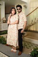 This Cream floral matching outfit set includes a women?s midi dress and a men?s short-sleeve shirt, both featuring vibrant red ethnic prints. Perfect for couples who love twinning in style at casual outings, festive gatherings, or vacations.